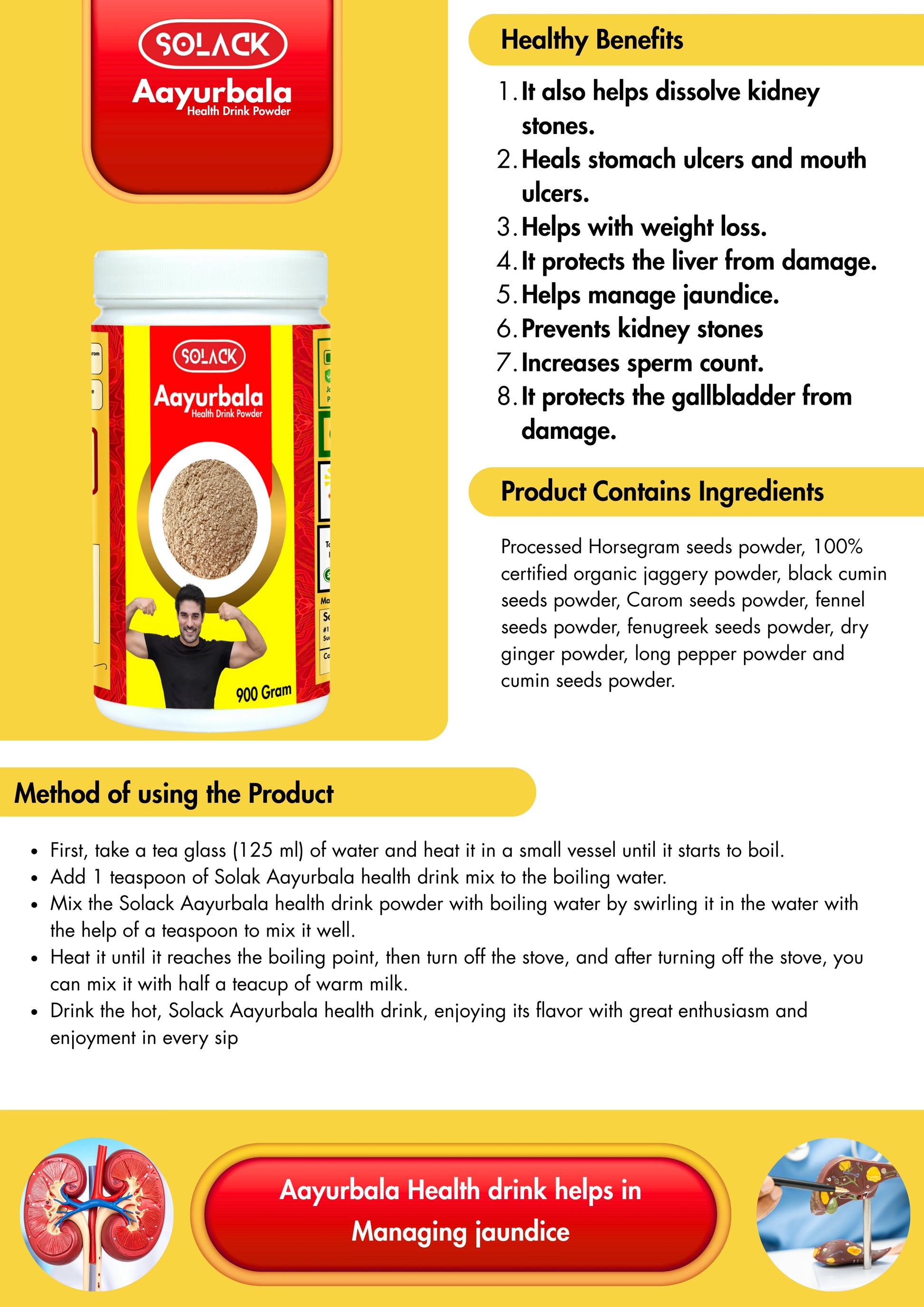 Solack Aayurbala Health Drink Powder delivers essential nutrients in a convenient 900-gram package. This carefully formulated blend harnesses the traditional benefits of horsegram, known for its protein content and nutritional profile. Regular consumption may support overall wellness as part of a balanced diet.