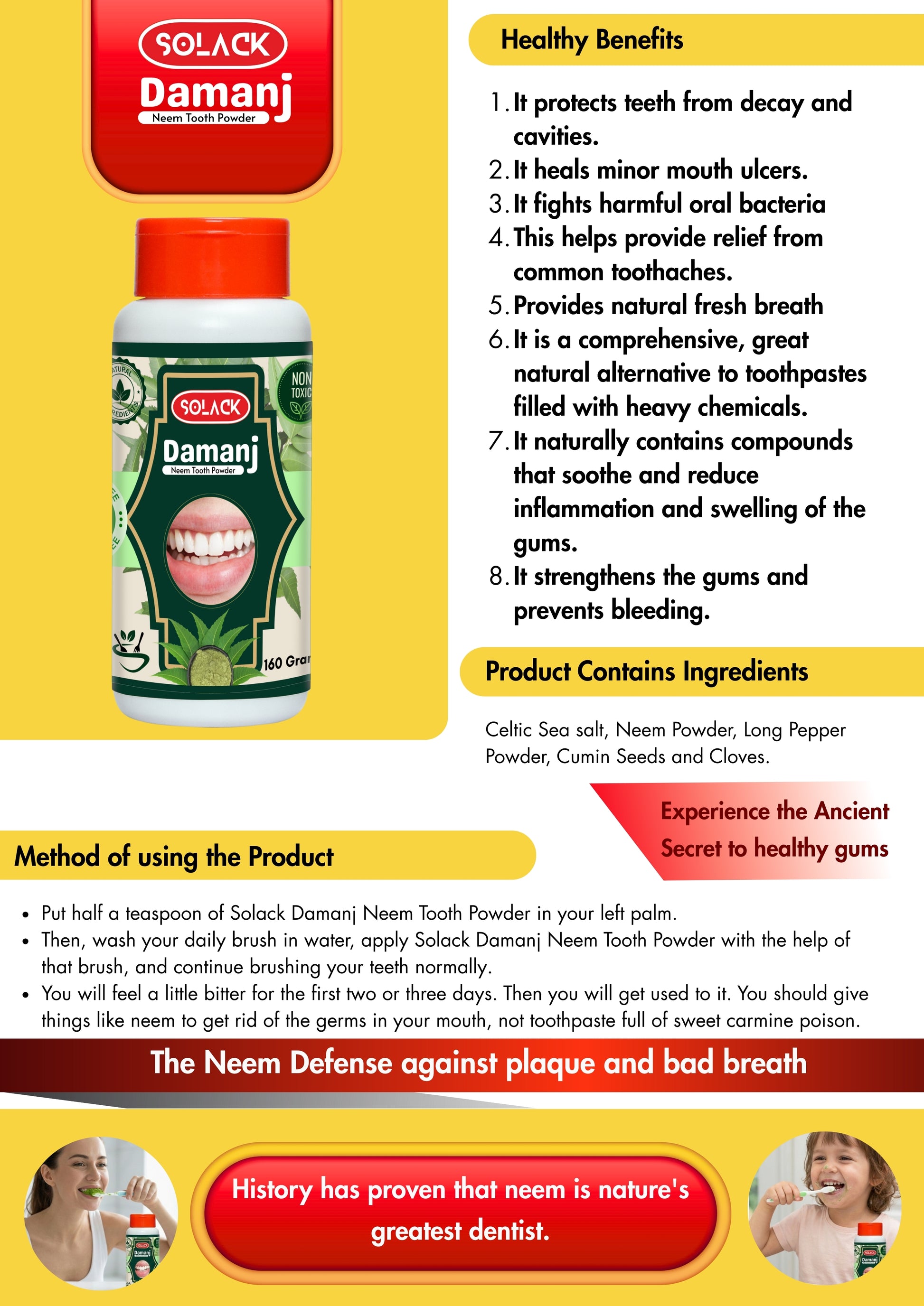 - Major Dental Health Benefits of Solack Damanj Neem Tooth Powder: It is prized for its wide range of properties that contribute to oral hygiene.